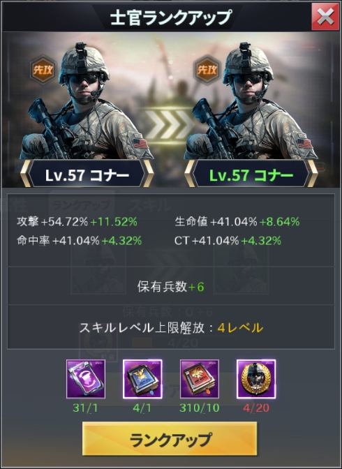 | 4 | 士官が緑品質に到達 | 士官バッジx40 | 戦力+12760 |