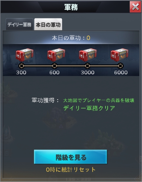 軍務の本日の軍功タブにて兵器破壊することやデイリー軍務タブの任務を達成することで得られる軍功(最大でも6K)によってゴールドと士官勲章を入手できる。