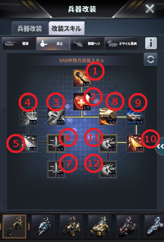 | 現状では特殊部隊は入手が困難なので、サタンミサイル車両の改造はコストがかかりすぎるためお勧めできません。 改造する際には現物、元となる兵器が無いと改造できないのと、改装スキルを進めていく上でも現物の兵器が多数必要になります。 |